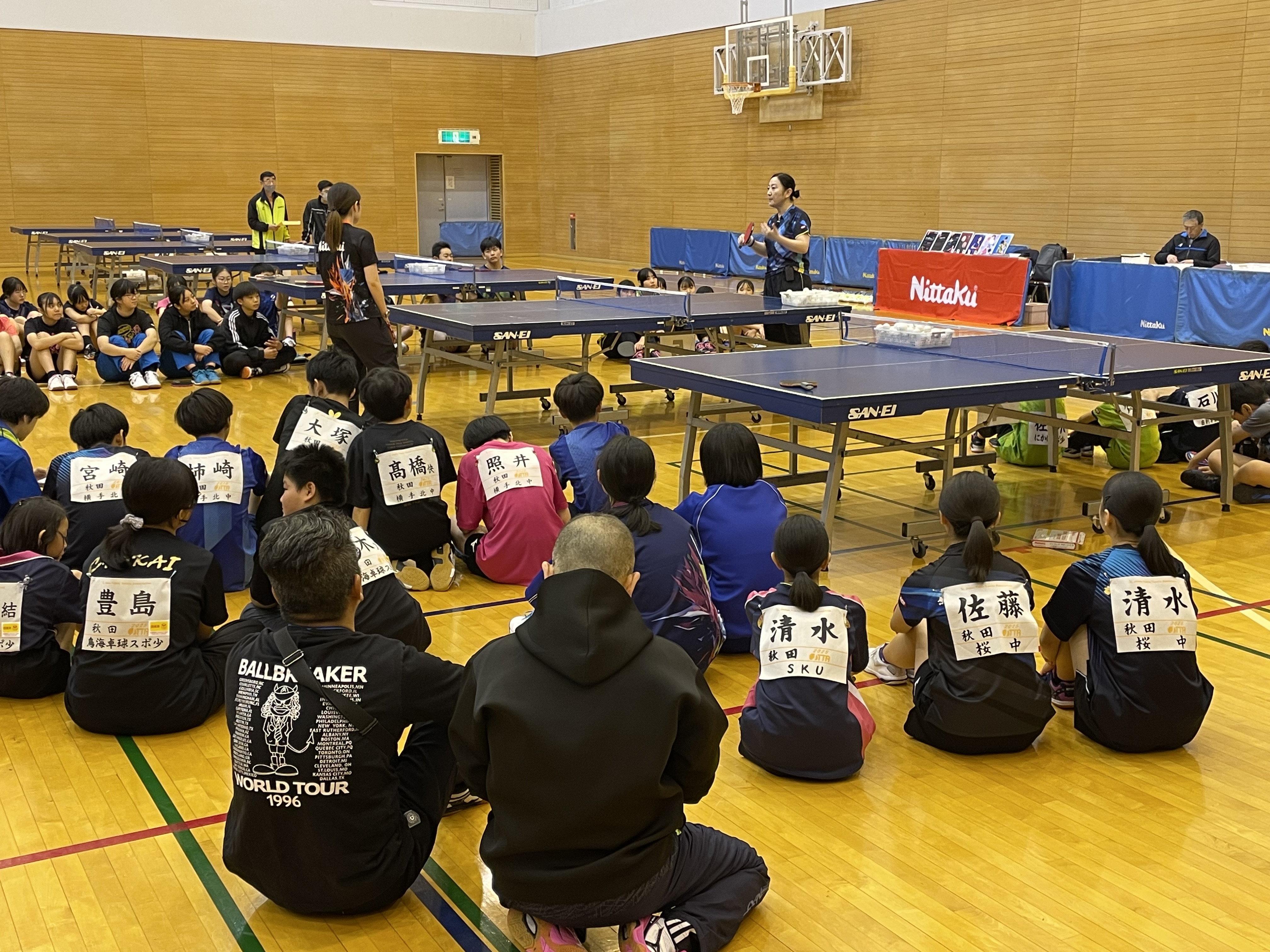 11月1日、秋田テルサ体育館で「2025年度 小・中学生卓球普及講習会 兼 指導者講習会」が開催され、秋田県の小・中学生96名・指導者17名が参加した。