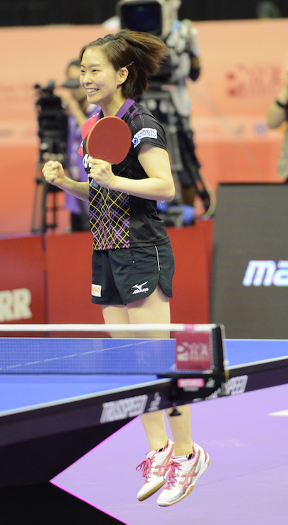 第4ゲームは、前半2−5とリードを許すが、劣勢に強い石川は落ち着いてボールに緩急をつけて対応し、5本連取して7−5。ストップレシーブからの展開も効果があり、ソルヤのミスを誘いながら、回転をかけたバックハンドドライブでコースを短長巧みに振り分け、11−7で勝利した。