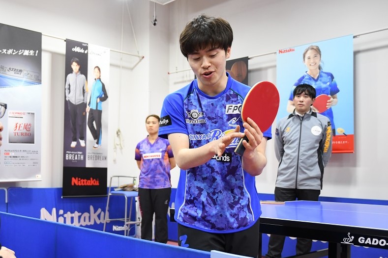 代名詞でもあるチキータを披露すると、会場は拍手喝采。森薗選手は、発売当初から愛用し、そのチキータを支えている「ファスタークG-1」について語られた。