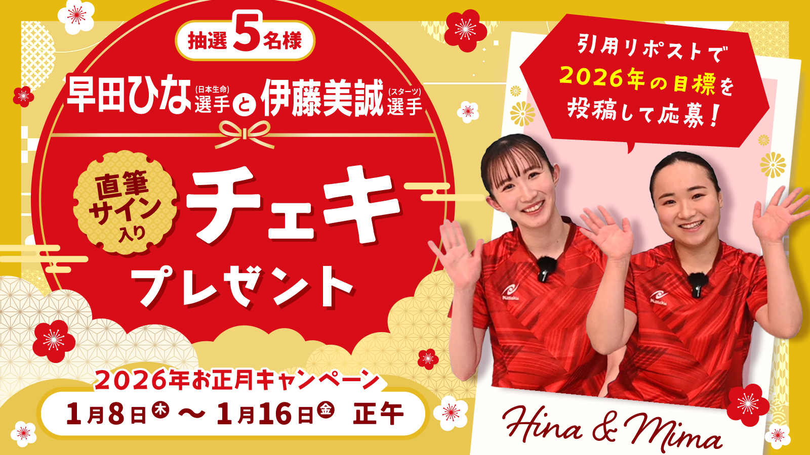X(旧 Twitter)でNittaku News 公式アカウントをフォローし、キャンペーン対象ポストに2026年の目標を引用リポストで書いていただいた方の中から、抽選で5名様に「早田ひな選手&伊藤美誠選手の直筆サイン入りチェキ」をプレゼント!