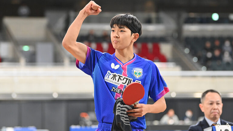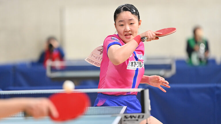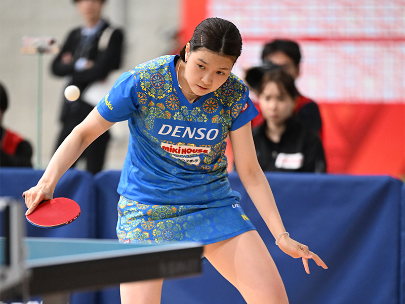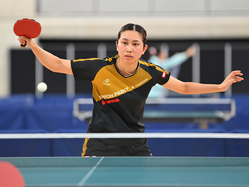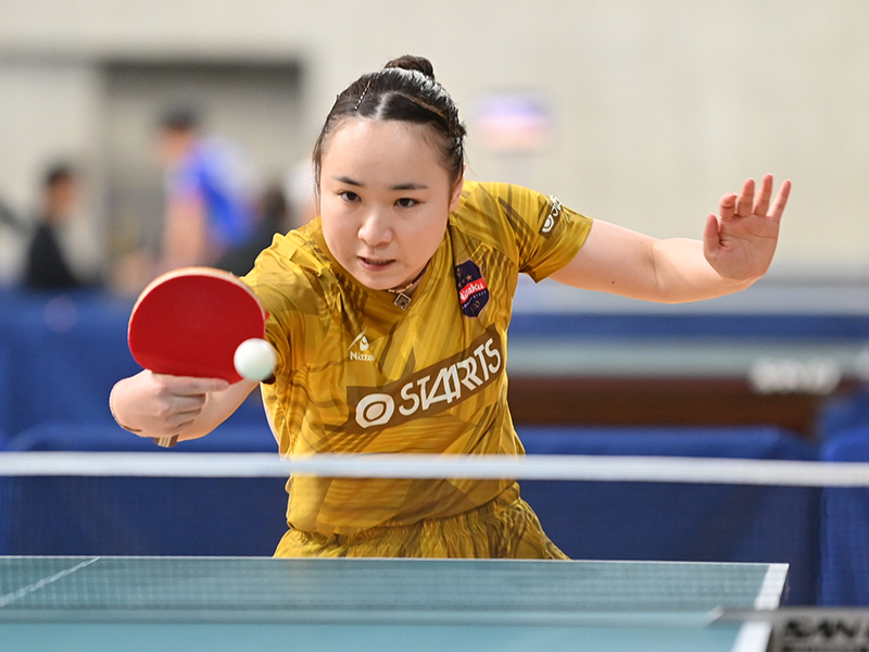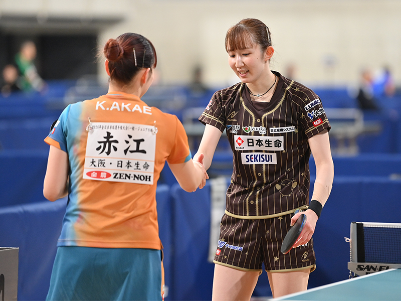 女子シングルス4連覇を狙う早田ひなは、全日本社会人女王の赤江との「ニッセイ同門対決」。ラリー戦に強い赤江の積極果敢な攻撃に2ゲームを落とし、苦しめられたが、「苦しい展開が続いても、最後に相手との勝負になった時、どこを攻めるのかという『選球眼』はしっかり最後まであった」と試合後のコメント。競り合いながらも要所を締めて4-2で勝利した。