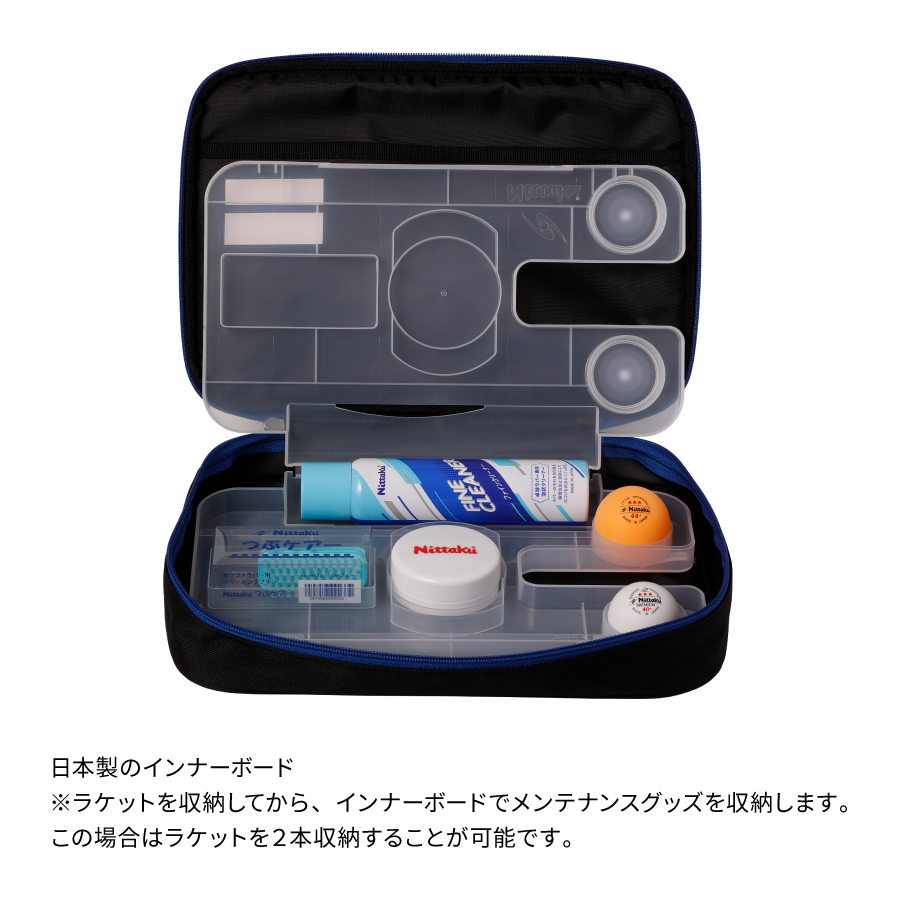 ラケット2本入用。メンテナンスグッズを収納できるインナーケース付き。